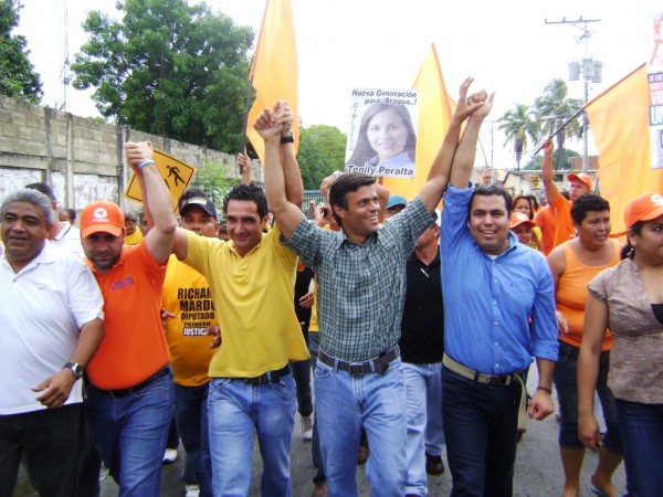 (Maracay, 12/09/10).- El coordinador nacional de Voluntad Popular, Leopoldo López, acompañó a los candidatos unitarios Rolman Rojas (circuito 2), Richard Mardo (Circuito 1), Ismael García (Lista) y Tenily Peralta, durante un recorrido por el varios sectores populares del municipio Francisco Linares Alcántara del estado Aragua.