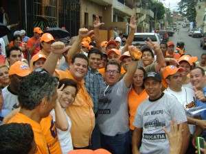 (Catia, 17/04/2010).- Una demostración de voluntad de participar en las primarias de la alternativa democrática y su apoyo a los precandidatos por el circuito 1 de Caracas, Franco Casella (Voluntad Popular) y José Quintero (Procatia), manifestaron cientos de habitantes de los sectores populares de la Parroquia Sucre de Caracas durante el recorrido que realizaron junto al coordinador nacional del Movimiento Voluntad Popular, Leopoldo López.