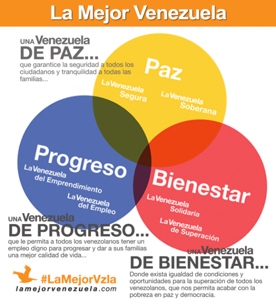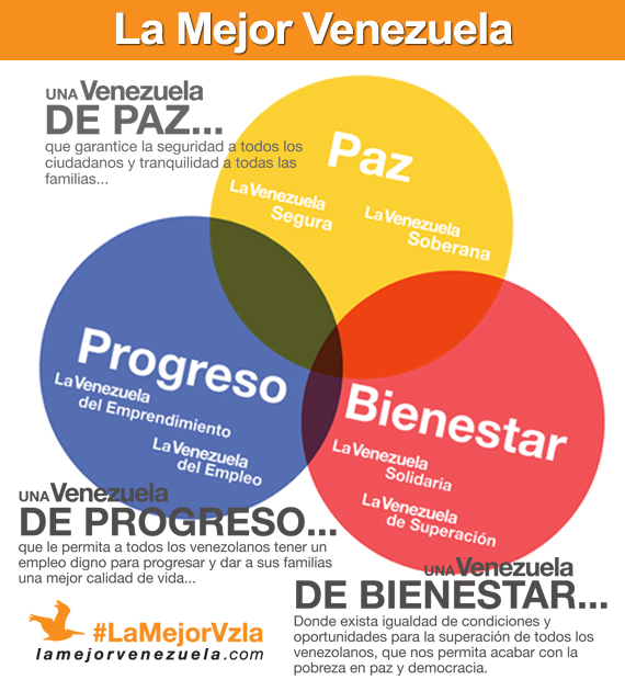 Me he dedicado en los últimos años a caminar el país, a visitar ciudades, pueblos, barrios y caseríos de todos los rincones de Venezuela. He escuchado a un pueblo agobiado por sus necesidades y sus problemas. He escuchado de venezolanos con pensamientos, orígenes, visiones y opiniones diversas; pero todos con algo en común: el sueño de un país diferente, con el que yo también sueño: La Mejor Venezuela.